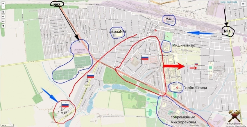 Противник удерживает восточный фланг с узлами обороны: жд. станция-Индустриальный институт-Горбольница, и южный фланг с микрорайонами Южный, Шахтерский, Солнечный и Лазурный. Западная часть города, преимущественно частный сектор с кладбищем и автопредприятием, выглядит слабой в обороне.