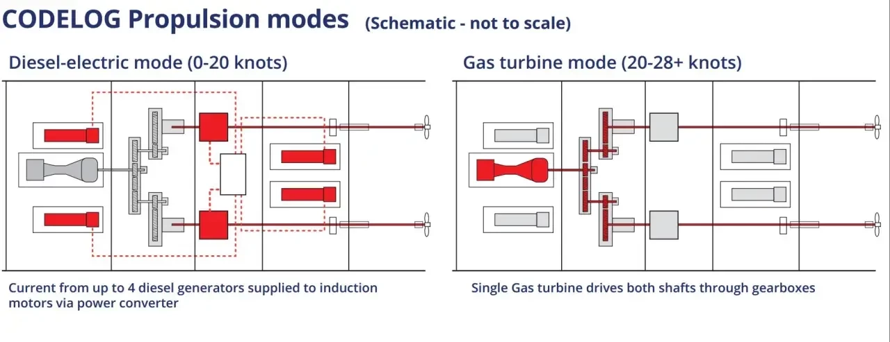 Предпочтительной силовой установкой для фрегатов Type 23, эсминцев Type 45, авианосцев Queen Elizabeth и, возможно, других военных кораблей по всему миру является комбинация газовых турбин для обеспечения высокой скорости и дизель-генераторов, приводящих в действие гребные электродвигатели. Хотя конфигурация такой силовой установки может существенно отличаться.