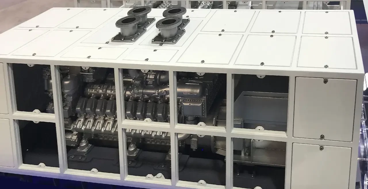 Дизель-генератор в акустическом кожухе и снятыми панелями доступа на выставке DSEI 2019. Слева дизель, справа виден генератор.