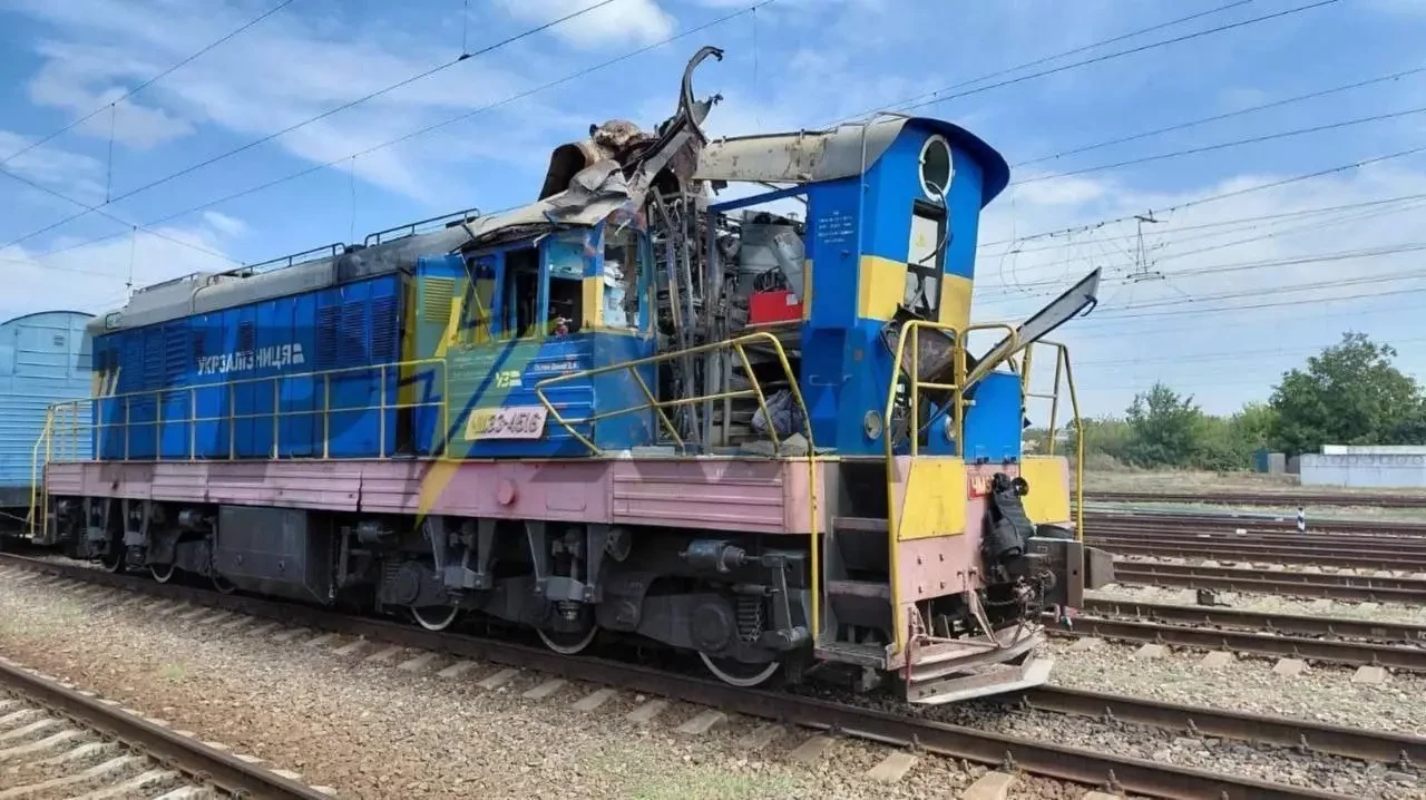 А это поражённый маневровый локомотив, перевозивший состав с военным грузом на станции Чаплино Днепропетровской области примерно в 29 км от линии фронта.