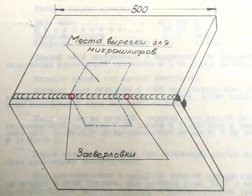 На втором образце были сделаны две засверловки. По засверловкам дефектов в сварных швах не обнаружено. Из средней части образца был вырезан участок для макро- и микроисследования.