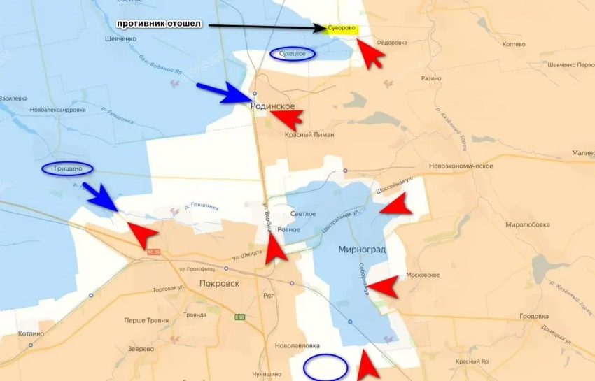По данным канала, в Покровске остались небольшие группы ВСУ, не успевшие выйти. Вся территория южнее железной дороги контролируется российскими войсками, севернее наши штурмовики зачищают кварталы от противника, выходя на окраины города.
