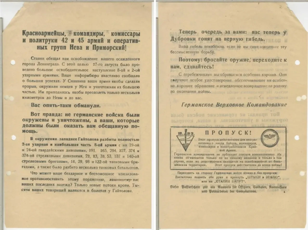 Одной из главных задач почти всех немецких листовок было побудить советских бойцов переходить в плен. На большинстве листовок было изображение пропуска с уточнением, что он действует для неограниченного числа солдат и офицеров (в начале войны по одному пропуску могли перейти до 50 человек). На пропусках была надпись, которую надо было выкрикнуть для обозначения своего намерения перехода к немцам («Штыки в землю!», «Сталин капут!» и другие).
