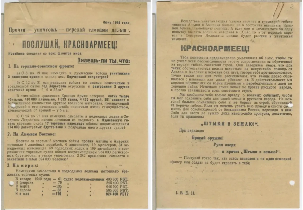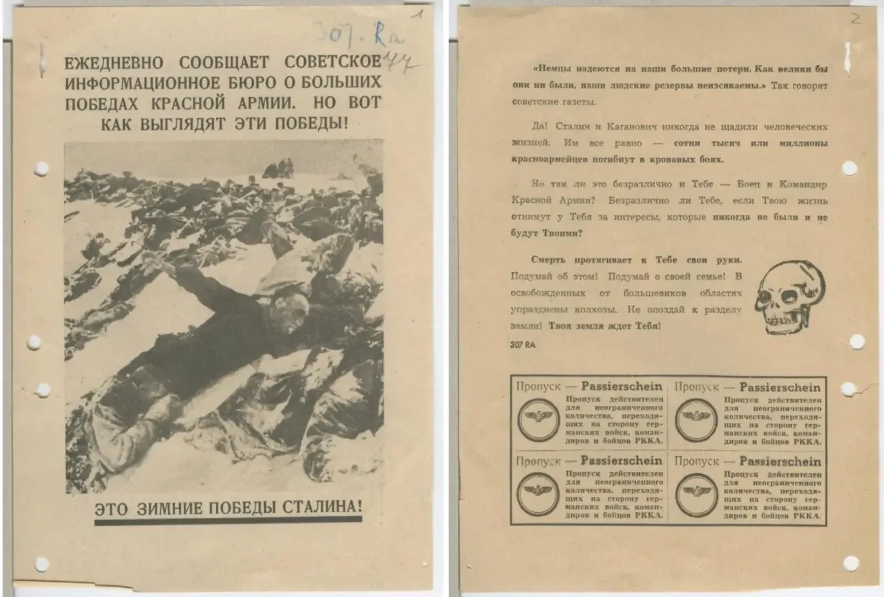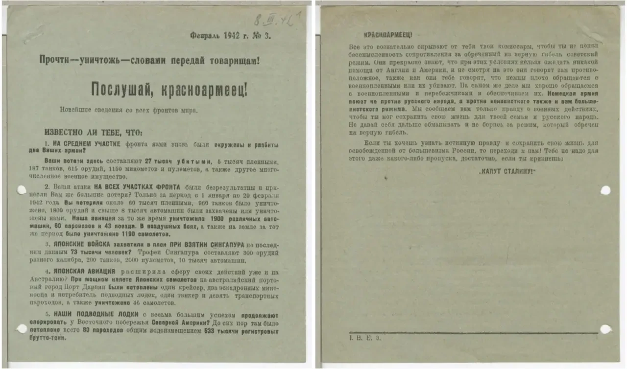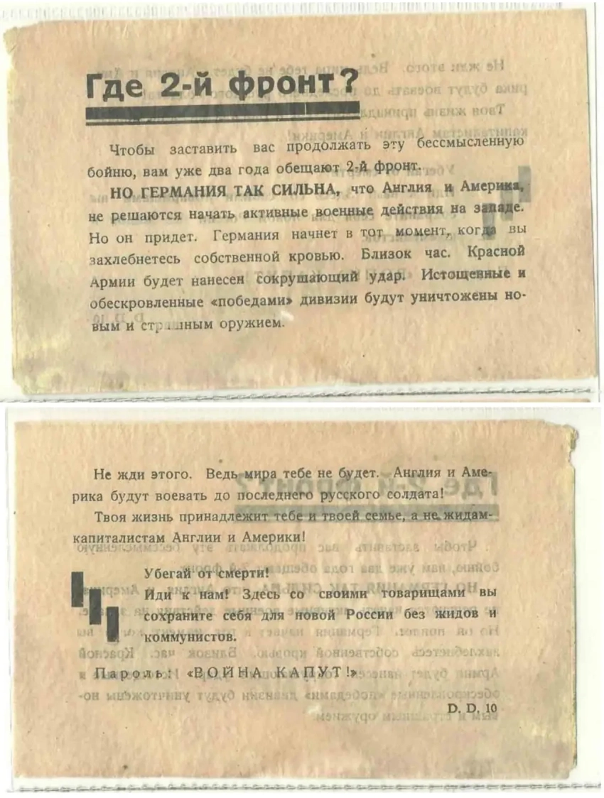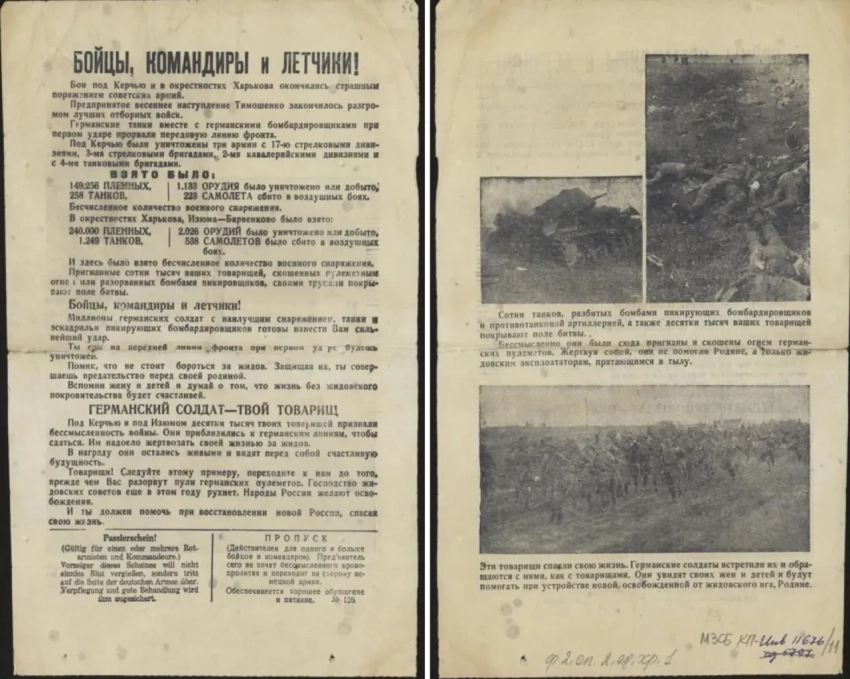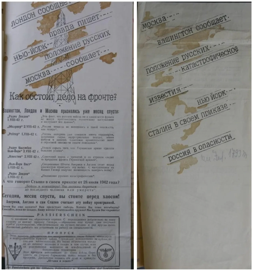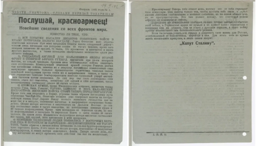 После таких заявлений напрашивалась необходимость дать со своей стороны некую «правдивую» информацию для советских солдат. Для этого периодически выпускались такие листовки, освещающие события в выгодном для немцев свете, или же вообще рассказывающие о событиях, которых не было.