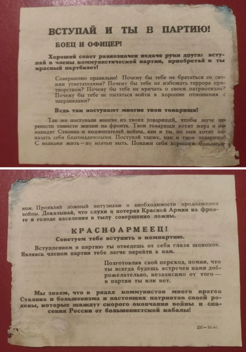 Были и более изобретательные средства, например, распространялись книжечки с названием «Не только тебе, но и твоим товарищам» со множеством отрывных пропусков и карикатур. Также нужно упомянуть о листовках, в которых объявлялось о том, что в рядах Красной Армии много врагов Сталина и солдат, сотрудничающих с немецкой армией. В них давалась рекомендация вступить в коммунистическую партию, «быть образцовым коммунистом», чтобы отвести от себя подозрения командиров в нелояльности советской власти, чтобы таким образом легче перейти к немцам.