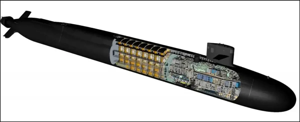 Основные характеристики: водоизмещение надводное 19 000 т, подводное около 20 800 т; длина 171 м (на 6 м длиннее Ohio); диаметр прочного корпуса 13,1 м. Главная особенность — электрический ход (permanent magnet electric drive) вместо привычного редуктора: тихоходный электродвигатель напрямую крутит вал, без шумного турбозубчатого агрегата. Это даёт акустическую сигнатуру на уровне лучших современных АПЛ 4-го поколения. В списке инноваций ядерный реактор S1B — ещё одно радикальное отличие от Ohio, которым активную зону меняли каждые 15–20 лет. Новая разработка не требует перезарядки за весь 42-летний срок службы лодки.