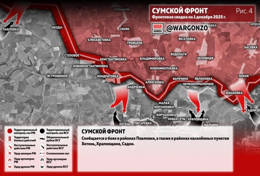 Вооружённые силы Российской Федерации (ВС РФ) за минувшие сутки продвинулись сразу на нескольких направлениях. Наш сайт N4k предлагает ознакомиться с последними новостями из зоны проведения СВО, а также публикует свежую карту боевых действий, актуальную на понедельник, 01.12.2025.