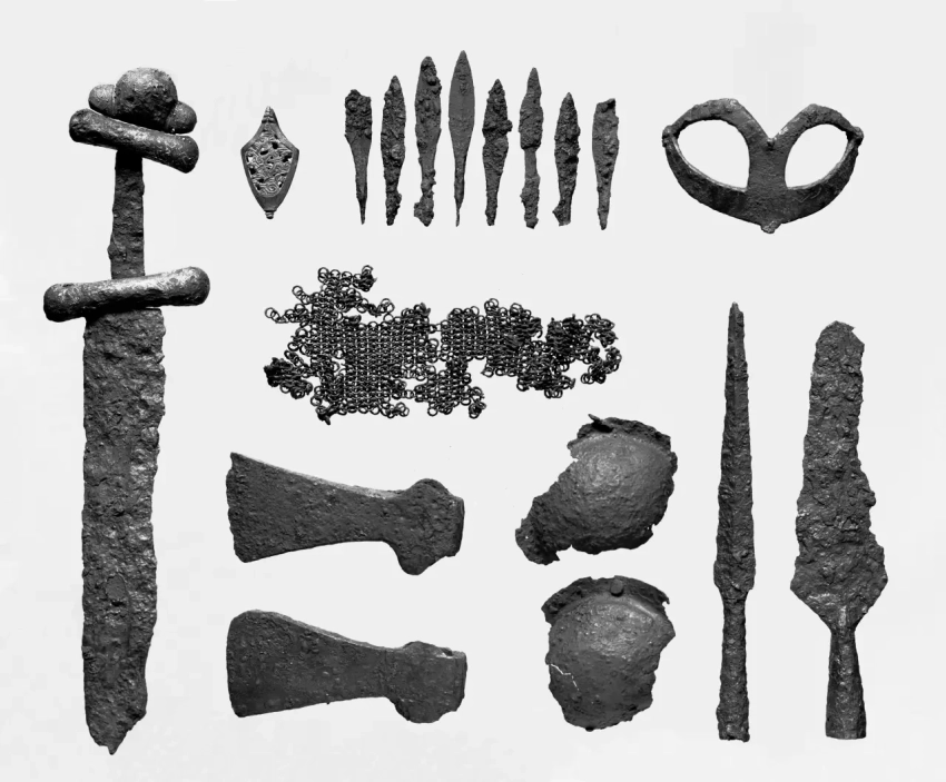 Находки в могиле знатного викинга, обнаруженной Ларсом Гьермундбю: меч, наконечник ножен, наконечники стрел, полумаска от шлема, остатки кольчуги, два топора, две половинки от купола шлема и два наконечника копья, один узкий, другой широкий. То есть, скорее всего, именно таким был арсенал состоятельных воинов-норманнов эпохи викингов. Исторический музей университета Осло