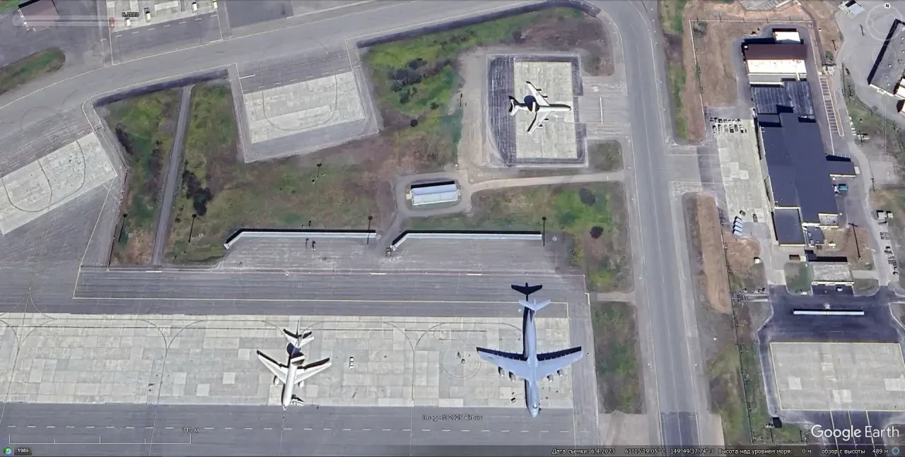 Спутниковый снимок Google Earth: самолёты ДРЛО Boeing E-3G Sentry и тяжелый военно-транспортный самолёт Lockheed C-5М Galaxy на авиабазе Элмендорф-Ричардсон
