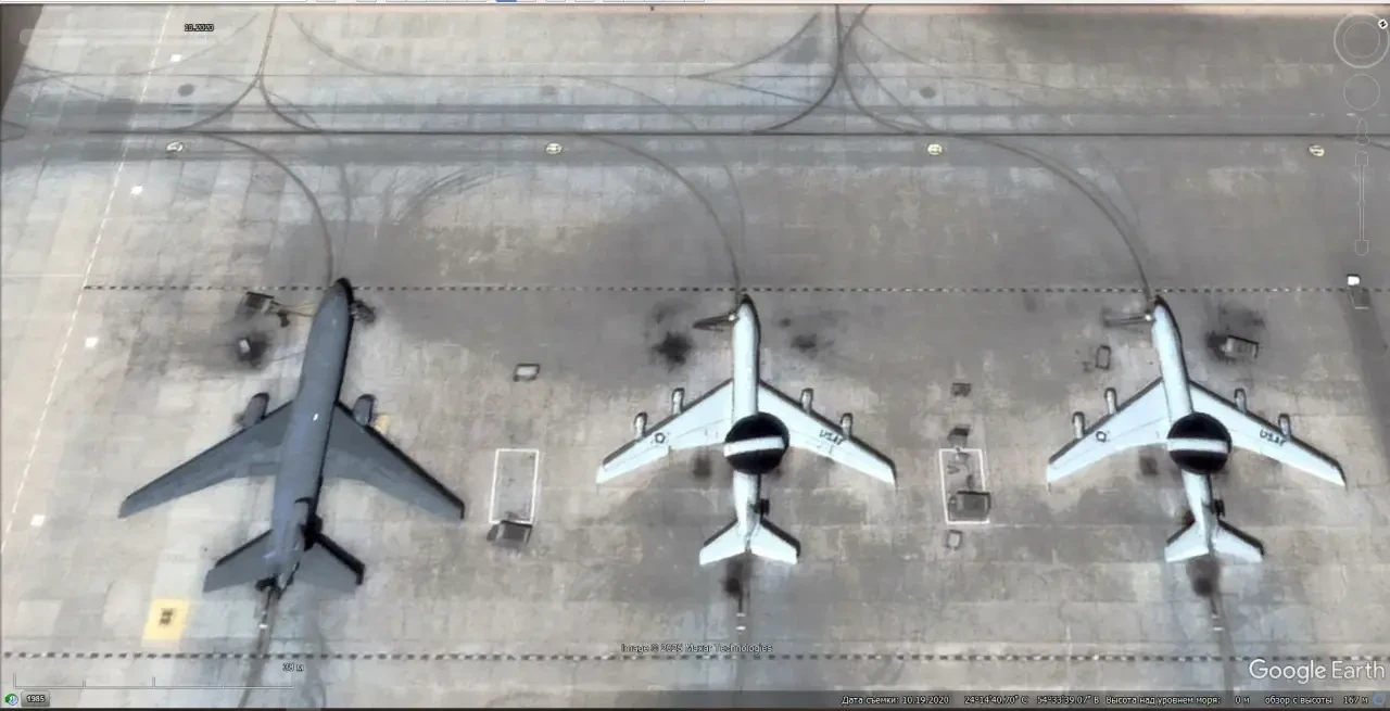 Спутниковый снимок Google Earth: самолёт ДРЛО Boeing E-3G Sentry и воздушные заправщики Boeing KC-135R на авиабазе Кадена