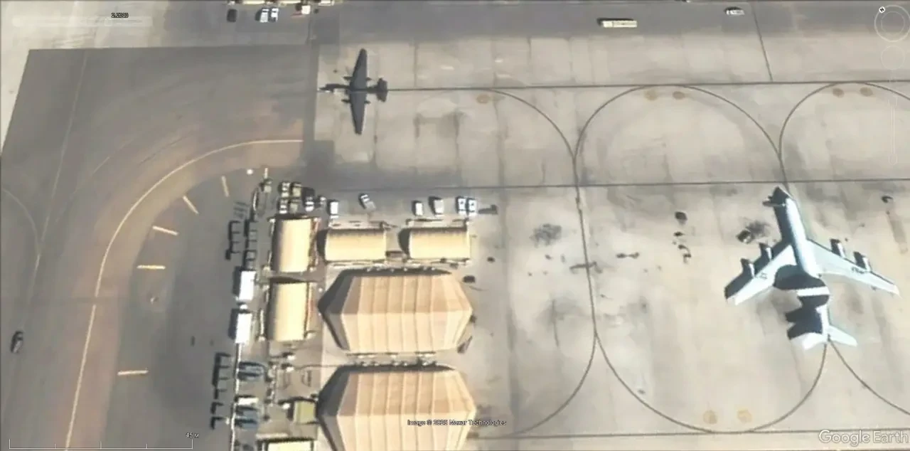 Спутниковый снимок Google Earth: самолёты ДРЛО Boeing E-3G Sentry и Boeing КС-46А Pegasus на авиабазе Аль-Дафра. Снимок сделан в октябре 2020 года
