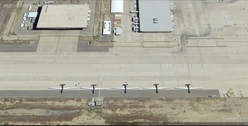 Спутниковый снимок Google Earth: самолёты Lockheed U-2S Dragon Lady на заводском аэродроме Lockheed Martin в Палмдейле. Снимок сделан в апреле 2017 года