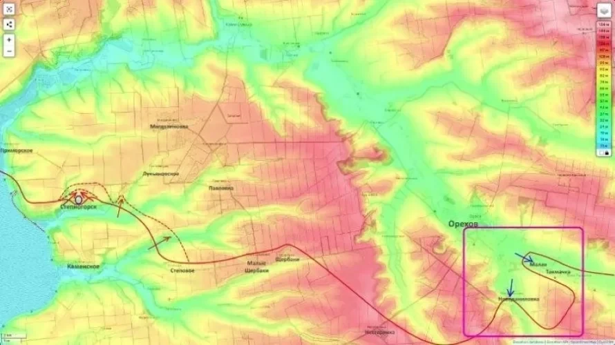 Особое значение имеет разворот левого фланга российских войск на северо-восток. Такой манёвр создаёт предпосылки для выхода в тыл ореховской группировки ВСУ и открывает новые оперативные возможности.