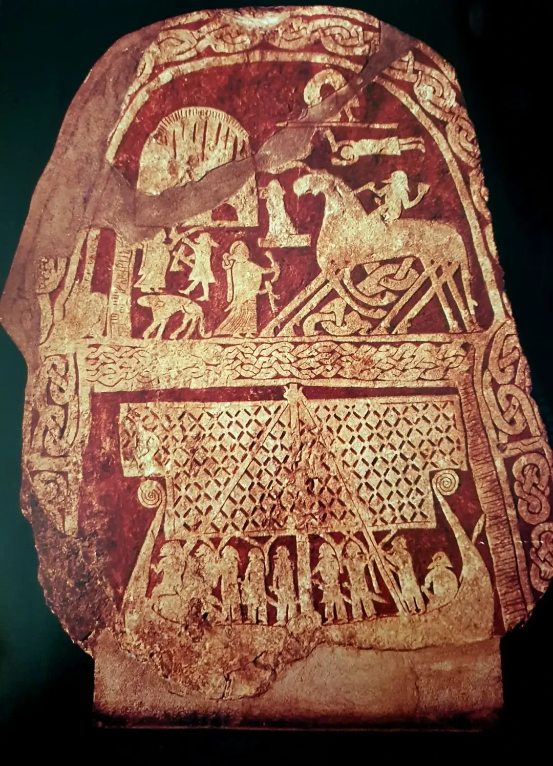 «Рунный камень»* викингов VIII в., изображает Слепнира вверху (восьминогий конь бога Одина) и проплывающий корабль внизу. Обнаружен в Тянгивде, Альскоге, Готланд, Швеция