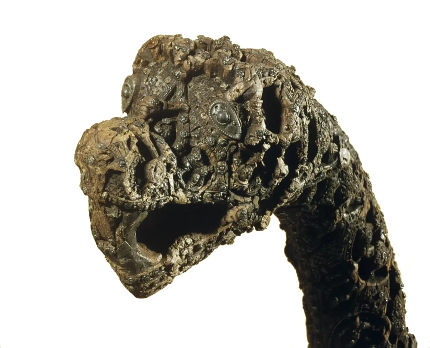 Голова дракона из погребения «Осебергского корабля». Фотография Музея викингов в Осло