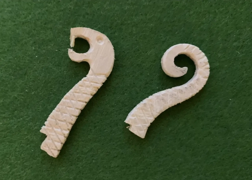 Вырезанные из ламеля резные оконечности – голова дракона и хвост. Обратите внимания на резную штриховку, изображающую чешую. Сделать ее желательно, потому, что с ней после раскраски обе эти детали будут выглядеть более эффектно. Фотография автора
