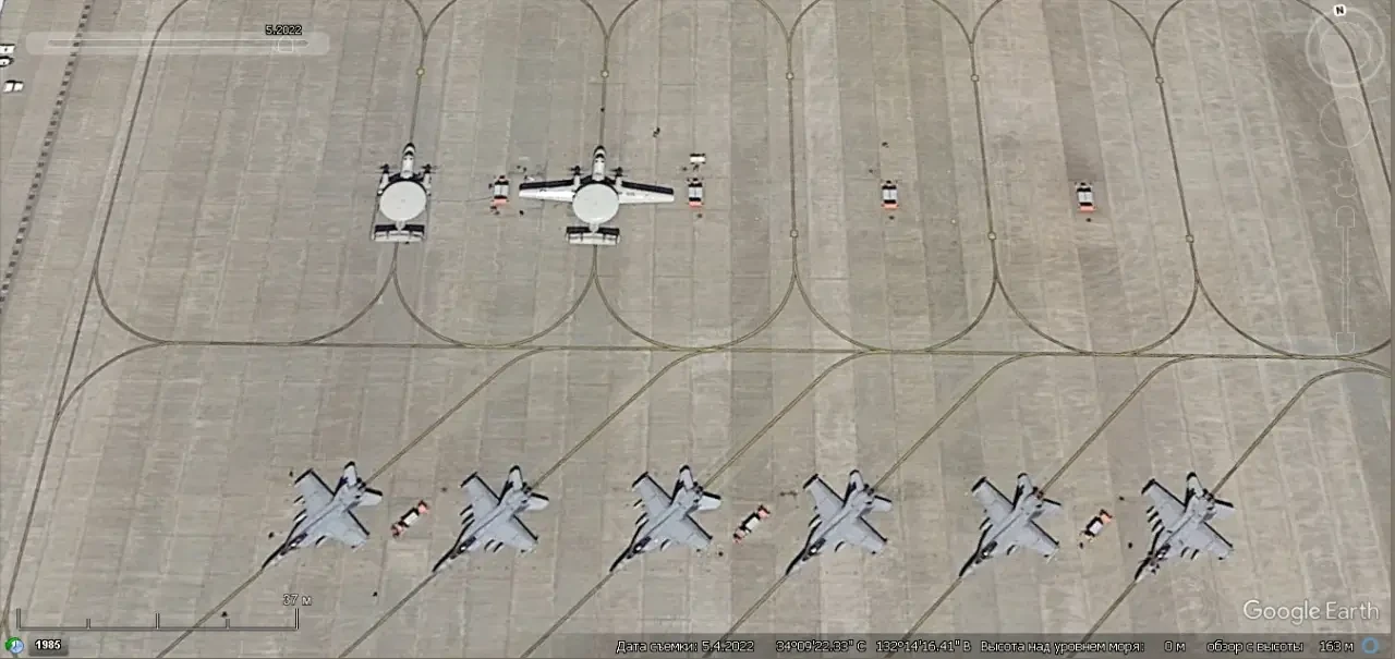 Спутниковый снимок Gооglе Eаrth: самолёты Northrop Grumman E-2D Advanced Hawkeye и Boeing F/A-18E/F Super Hornet на авиабазе Ивакуни