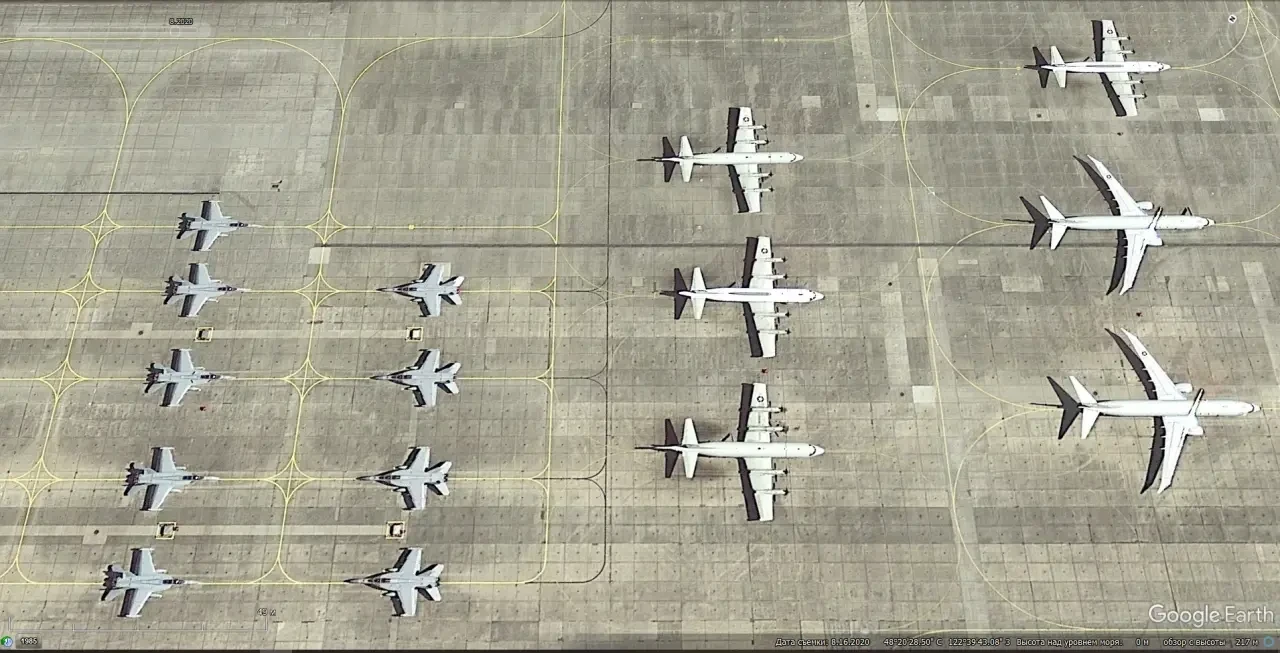 Спутниковый снимок Gооglе Eаrth: самолёты Boeing P-8А Poseidon на авиабазе Кадена. Снимок сделан в мае 2019 года