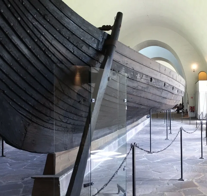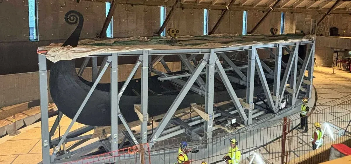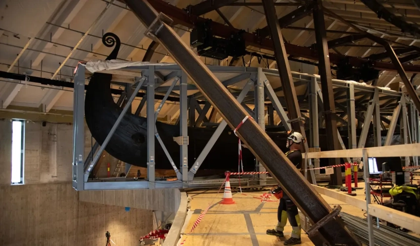 Более того, здание старого музея кораблей викингов решили заменить на новое, более просторное и удобное, и разместить самые впечатляющие корабли там. Сделать это было непросто, хотя расстояние до нового здания было невелико – всего-то около 100 метров. И, тем не менее, это была сложная инженерная операция. Из-за хрупкости кораблей обращаться с ними нужно было исключительно осторожно, особенно с более тяжелым и менее прочным гокстадским кораблем. Так, «Осеберг» более двух лет был заключён в стальной каркас весом более 50 тонн, что позволило ему оставаться на месте в течение всего времени строительства нового здания музея. Переместили корабль на новое место в сентябре 2025 года, причем передвигался каркас с кораблем по рельсу, укрепленному под потолком, очень медленно, со скоростью всего 30 см в 5,5 минут, то есть ехал он к новому месту пребывания целых 10 часов.