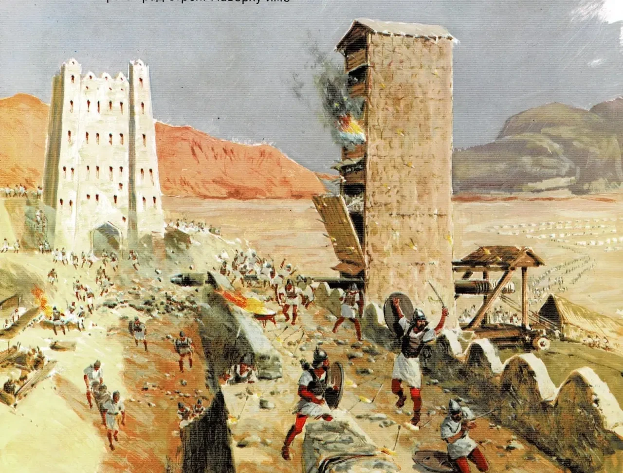 Осадная башня штурмует город. Иллюстрация из книги «Семь чудес света». Ганс Райнхардт, художники Анне-Лиз Име и Герд Вернер. Изд-во «Слово», 1987 г.