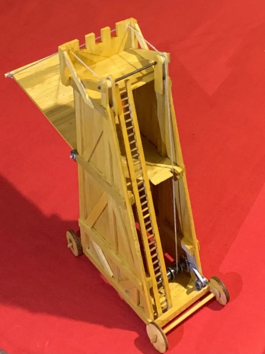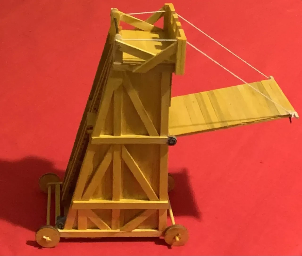 Макет такой осадной башни совсем не трудно сделать из палочек-мешалочек для кофе, склеенных клеем ПВА. Надо только иметь в виду, что они бывают разные. Для нашей цели лучше всего подходят самые длинные и толстые: 178х6х1,3 мм. Из них получаются отличные несущие балки. А вот на сами «доски» для обшивки башни годятся более короткие и тонкие: 140х5х1 мм.