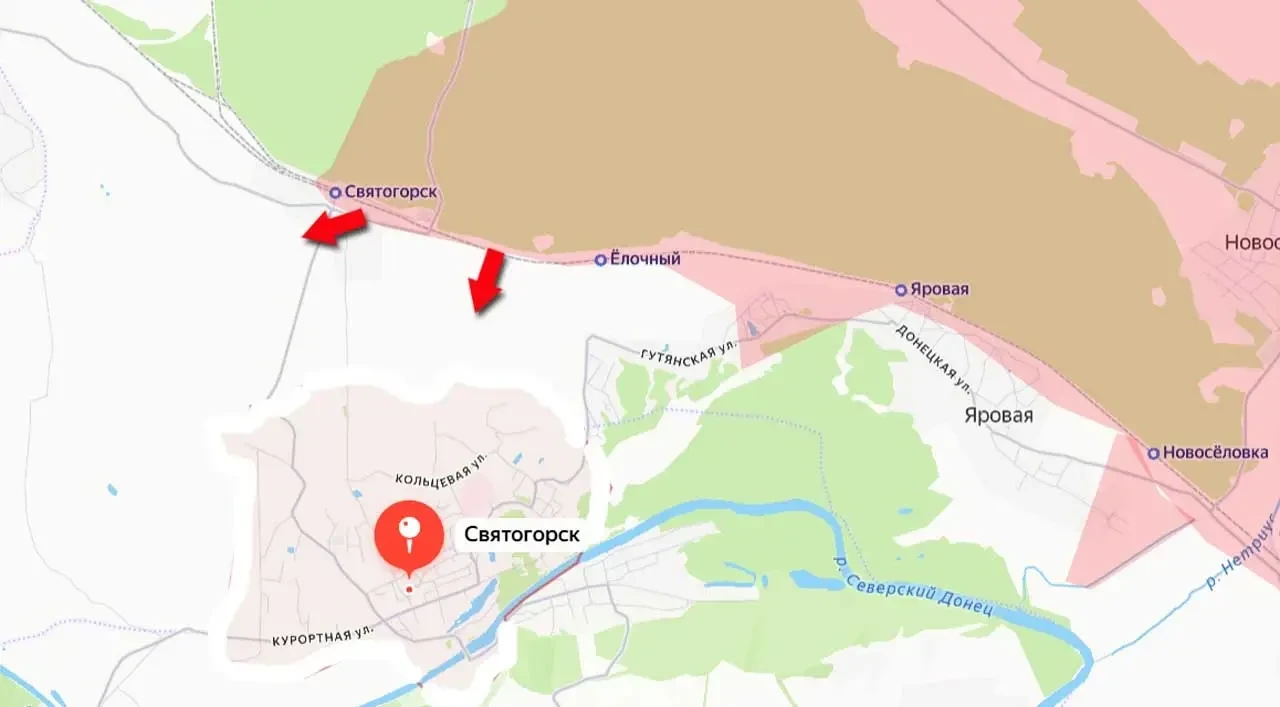Российские войска развивают наступление на севере Донецкой Народной Республики. Поступают сообщения о том, что в результате наступательных действий Вооружённые силы РФ прорвались к северу от Святогорска, выбив противника с территории ключевых станций. Речь идёт о станциях (ОП) Ёлочный и, собственно, Святогорск.