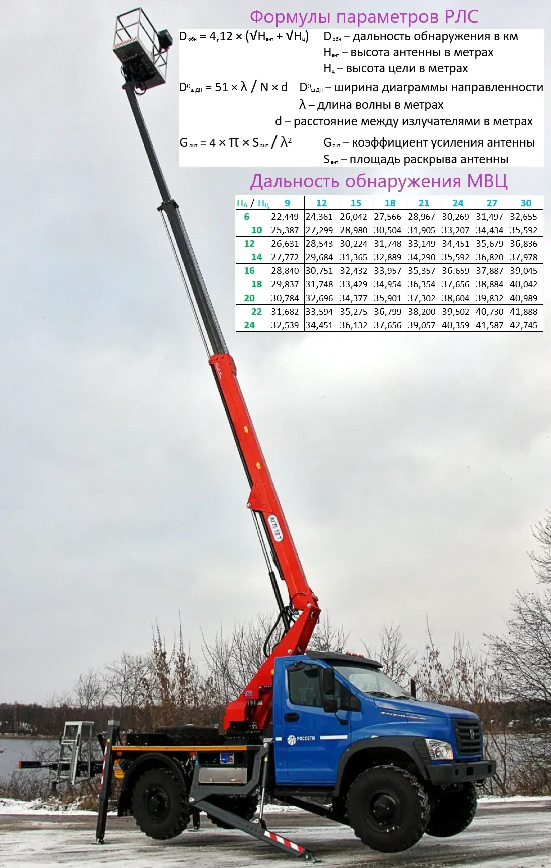 Прежде всего, для увеличения дальности обнаружения маловысотных целей откажемся от бронированного внедорожника в пользу серийного гражданского автомобиля повышенной проходимости с вышкой, которой доступна рабочая высота подъёма 22 метра.