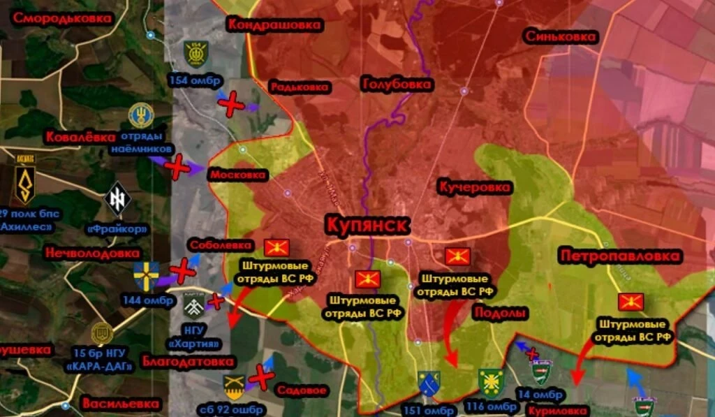 Военный блогер Олег Царёв отметил, что на Купянском направлении, на юго-востоке от взятого под контроль села Подолы, российские войска зашли в Куриловку, взяли северную часть села и продвигаются к его западной окраине вдоль реки Лозовой.