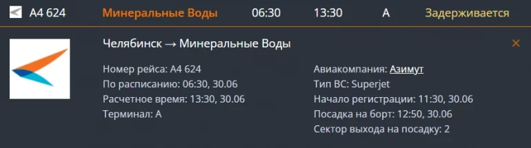 Утром в пятницу, 30 июня, в аэропорту Челябинска из-за позднего прибытия самолёта на семь часов задержали рейс авиакомпании «Азимут» в Минеральные Воды. По данным онлайн-табло, вылет воздушного судна перенесли с 6:30 на 13:30. Ситуацию взяла на контроль Уральская транспортная прокуратура.