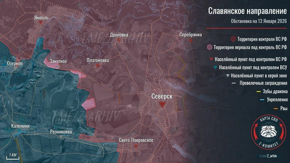По состоянию на 13 января расстояние от российских позиций, расположенных к юго-востоку от Пришиба, до северной окраины Славянска составляет около 14,5 километров. От передовых позиций ВС РФ в районе села Диброва, которое находится южнее Красного Лимана, расстояние до Славянска составляет около 13,5 км.