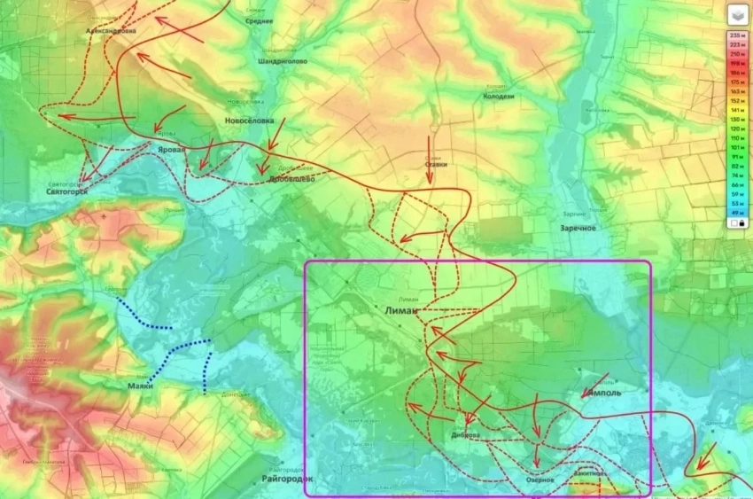 Параллельно поступают сообщения о выходе передовых отрядов ВС РФ восточнее Пришиба, непосредственно на восточный берег Северского Донца. Эти сведения косвенно подтверждаются и украинскими мониторинговыми ресурсами, фиксирующими потерю контроля над территориями.