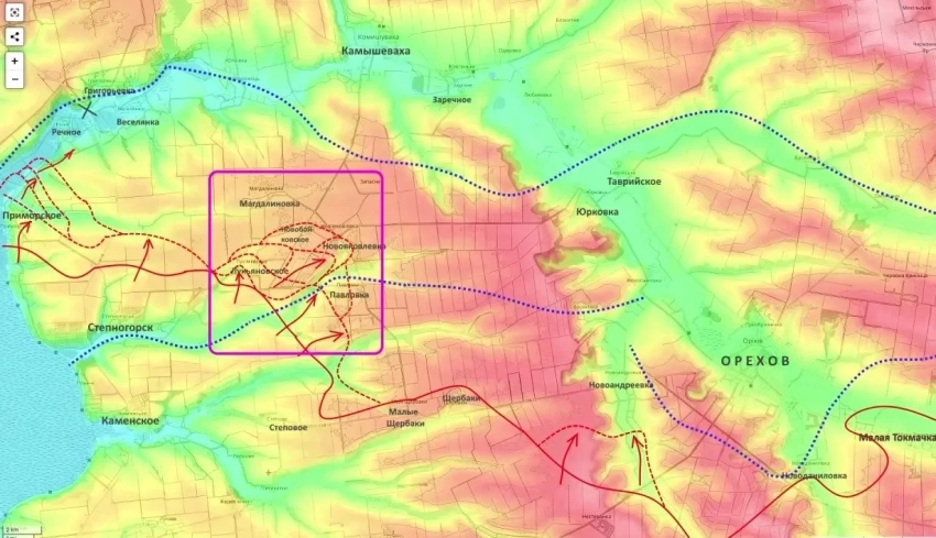 Как отмечает издание «Страна.ua», расстояние от Приморского до окраин Запорожья составляет менее 15 километров, что позволяет использовать беспилотники, ствольную артиллерию и все виды корректируемых авиабомб (КАБ).