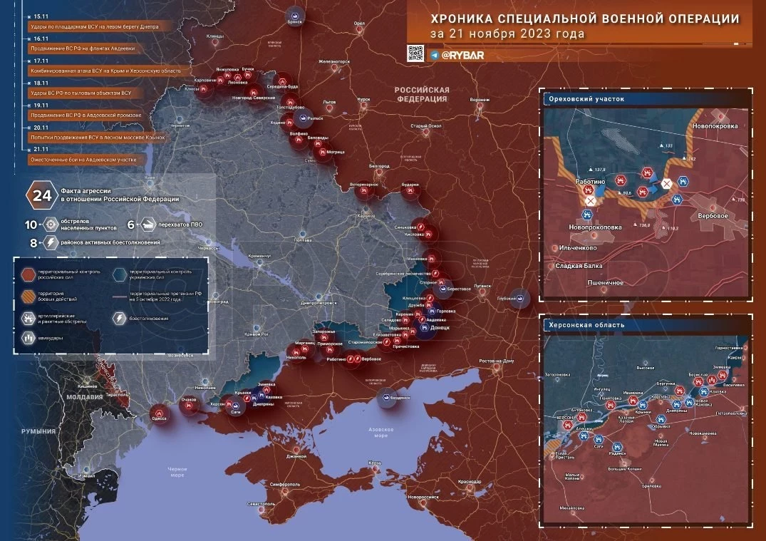 Карта боевых действий на Украине по данным на 06:00 мск сегодня, 22 ноября 2023 года