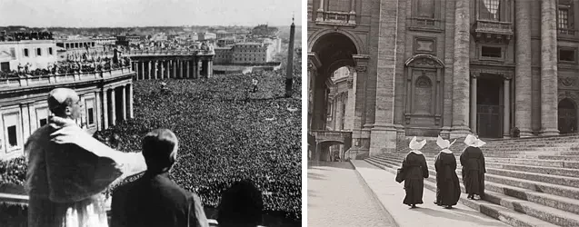 Папское государство до подписания Латеранских соглашений (1870-1929). Фото слева: въезд на закрытую территорию. Фото: Abeniacar/Getty Images. Фото справа: редкое фото Пия IX с некоторыми его прелатами. Источник: Rai Cultura