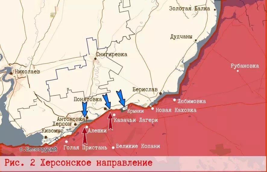 Херсонское направление без перемен. ВСУ сохраняют позиции в центральной части Крынок и на двух других плацдармах — у Антоновского и ж/д мостов. На линии сел Поймы-Песчановка-Подстепное армия России отражает постоянные попытки ВСУ выйти к трассе и осложнить снабжение нашей Херсонской группировки. В свою очередь нашим пока не удается даже пресечь снабжение ВСУ с правого берега, не говоря о ликвидации плацдармов.