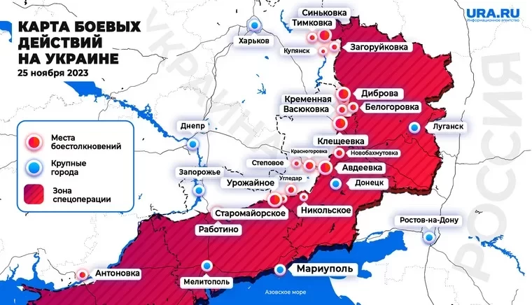Обновлённая карта боевых действий на Украине на 13:00 мск от 25.11.2023