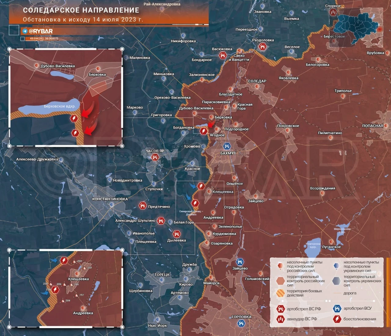 Карта боевых действий: Соледарское направление Обстановка к исходу 14 июля 2023 года