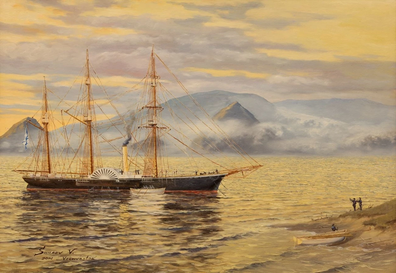 Валерий Шиляев. Пароходо-корвет “Америка” в бухте Находка (холст, масло), 2001.. Фото: из открытых источников