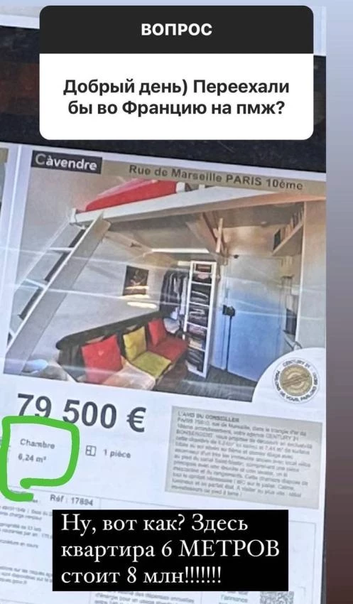 Чтобы проиллюстрировать свою точку зрения, Мягкова решила поделиться фотографией небольшой однокомнатной квартиры в Париже и с удивлением отметила, что за такое жилье просят огромную сумму восемь миллионов рублей. Эти завышенные цены вызвали у нее разочарование и осознание того, что иметь собственное жилье в Париже становится почти непосильной задачей.