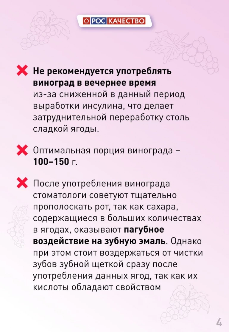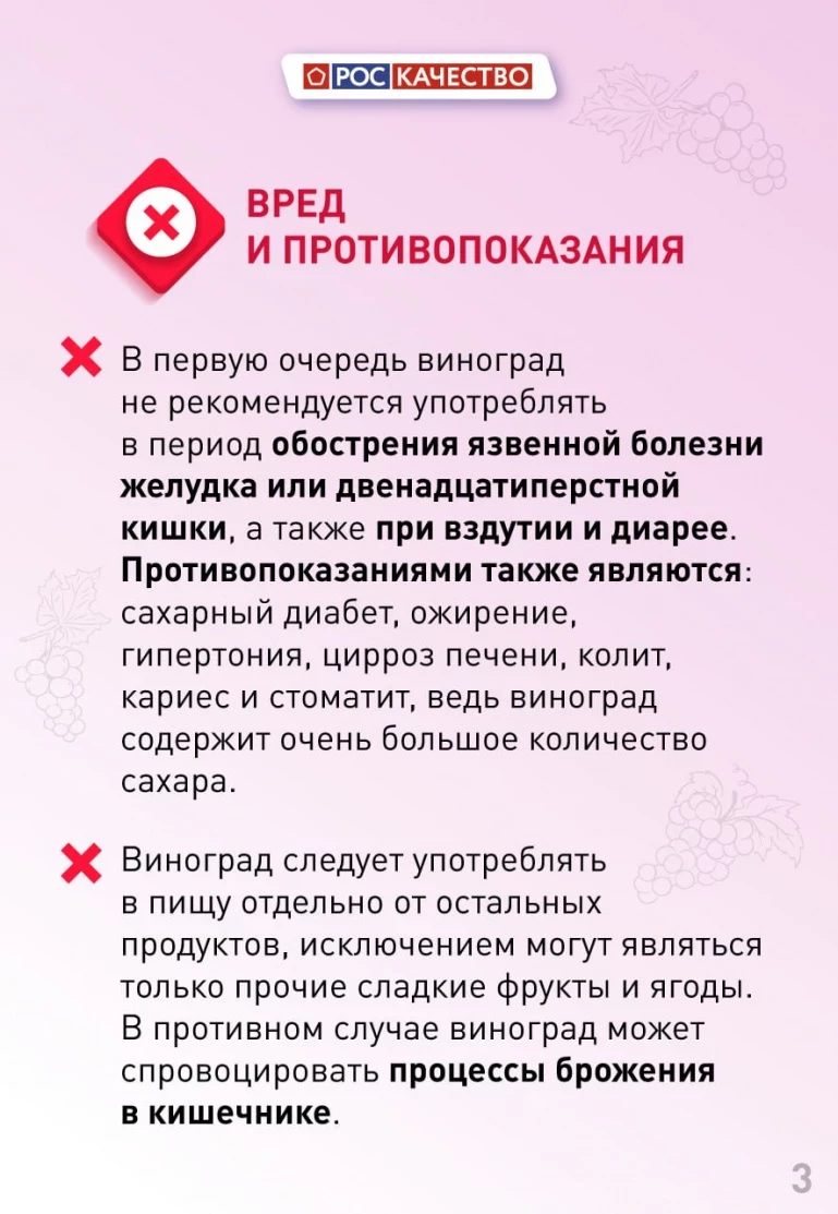 Как бы ни была полезна эта ягода, виноград может и навредить. Причина — большое содержание сахара. Не стоит его есть, к примеру, при обострении язвенной болезни или двенадцатиперстной кишки, при вздутии и диарее. В списке противопоказаний также сахарный диабет, ожирение, гипертония, цирроз печени, колит, кариес и стоматит.
