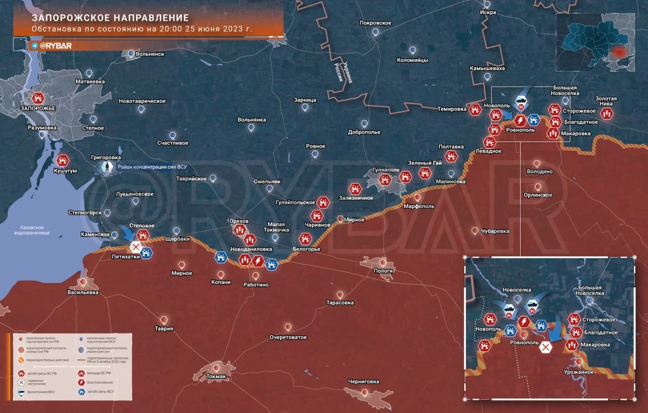 Карта боевых действий: Донецко-Запорожское направление обстановка по состоянию на 20.00 25 июня 2023 года