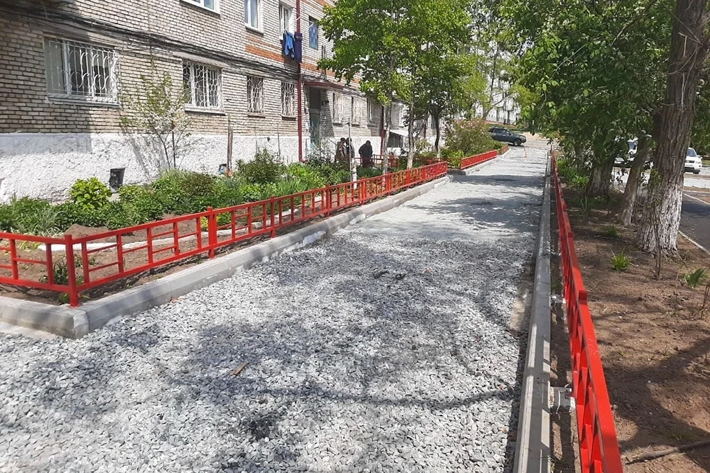 Здесь, благодаря программе Минвостокразвития России “1000 дворов Дальнего Востока”, было благоустроено 10 придомовых территорий — обустроена прогулочная зона, пешеходные дорожки, отремонтирована проезжая часть, установлены лавочки и игровые площадки для детей.