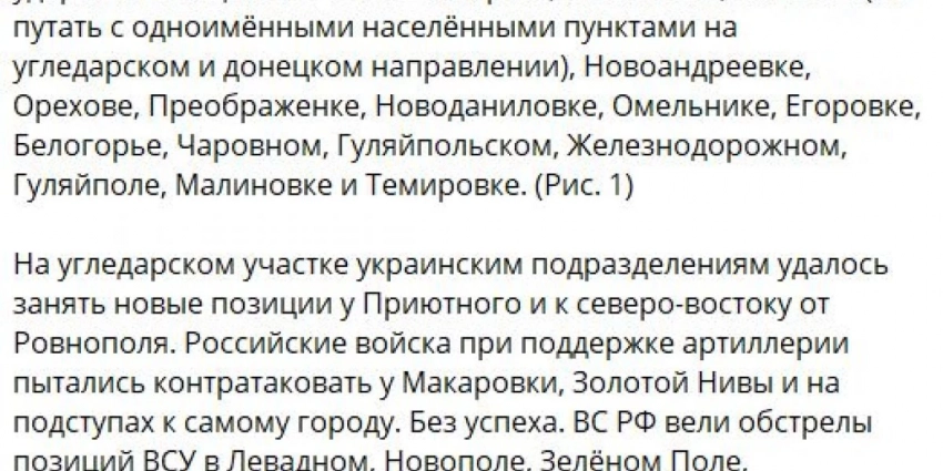 - Запорожское направление: пятихатки в серой зоне. На Ореховском и Гуляйпольском участках продолжаются ожесточенные бои, боевики пытаются атаковать российские позиции. Также враг перебрасывает резервы к передовой в районе Орехова. Кроме того, ВС РФ стоит ожидать атак ВСУ в районе Урожайного и Новодонецкого.