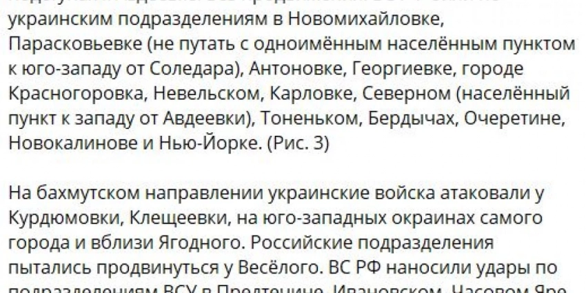 - Бахмутское (Артемовское) направление: ВСУ предпринимают попытки наступления в направлении Берховки и Ягодного. Также боевики атакуют позиции России в районе Клеещеевки;