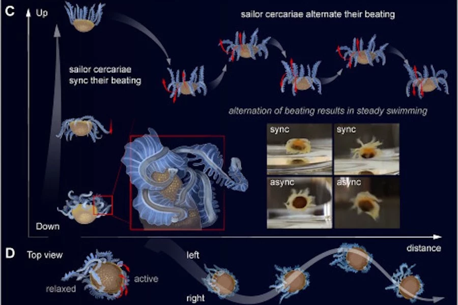 Исследователи обнаружили колонию церкарий, свободноживущих личинок Digenea, состоящую из двух различных морфотипов. Более крупные церкарии, названные «моряками», были ответственны за передвижение, в то время как меньшие церкарии, «пассажиры», предположительно помогали в заражении.