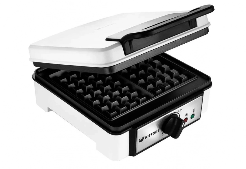 Завершает наш обзор вафельница Kitfort KT-1620, предназначенная для приготовления венских и бельгийских вафель. Антипригарное покрытие позволяет готовить без использования масла или с минимальным его количеством. В каждой части рабочей поверхности находится нагревательный элемент, благодаря чему кондитерские изделия пропекаются равномерно. Вафельница kitfort оснащена световыми индикаторами включения и готовности к работе, термостатом с плавной регулировкой температуры и отсеком для хранения шнура.