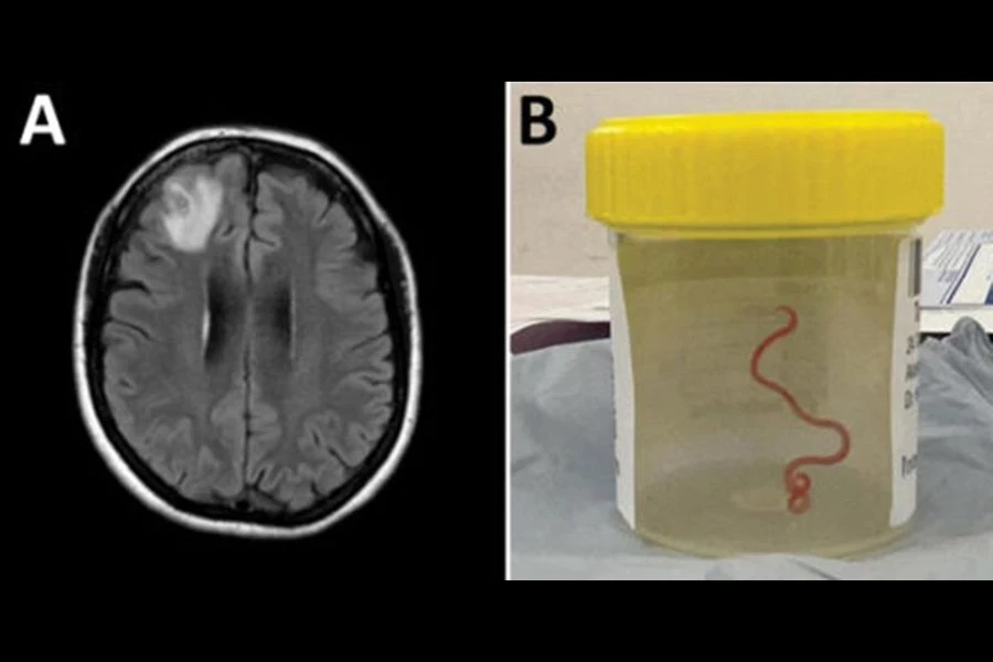 Во время операции на открытом мозге 64-летней женщины врачи больницы Канберры заметили длинную, похожую на струну структуру внутри поражения, поражающую ее правую лобную долю. Вытащив его, они поняли, что это живой извивающийся круглый червь. Тематическое исследование было опубликовано в журнале Emerging Infectioushoods.