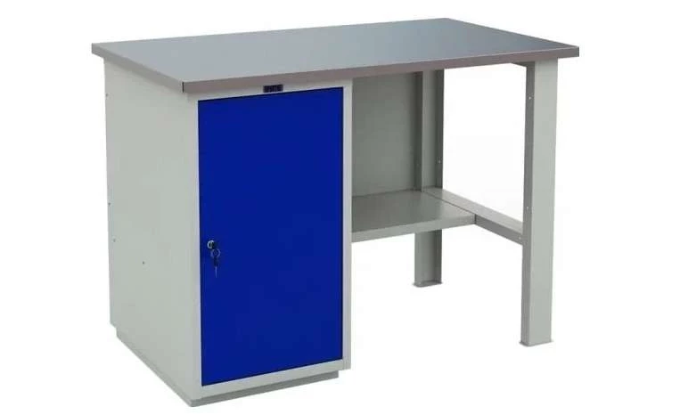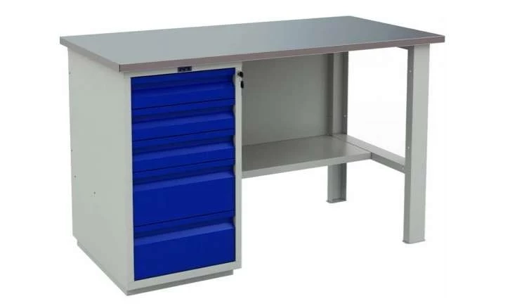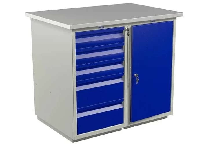 Эта модель верстаков Практик напоминает комод. Столешница выполнена из МДФ толщиной 24 мм, также есть металлические вставки из оцинкованной поверхности 1.2 мм. Порошковая окраска серого и синего цвета выступает не столько предметом декора, сколько защитой от коррозии. Допустима комплектация перфорированным экраном, освещением, а также аксессуарами для размещения инструментов.