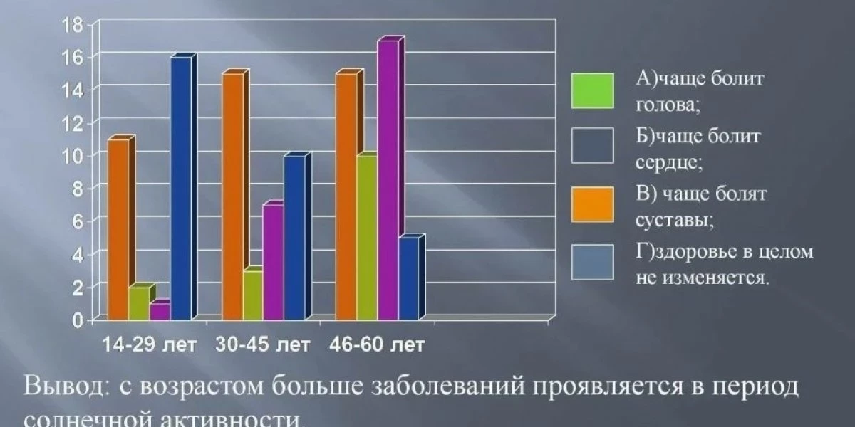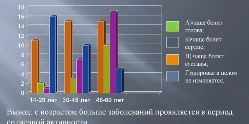 Известно, что возмущения на Солнце у некоторых людей провоцируют головные боли, ощущение усталости без причины и сонливость. Российские ученые пришли к выводу, что магнитные бури могут влиять на свертываемость крови, а их коллеги из Университета Манчестера выяснили, что магнитные бури, низкое давление, влажность и ветер усиливают хроническую боль.