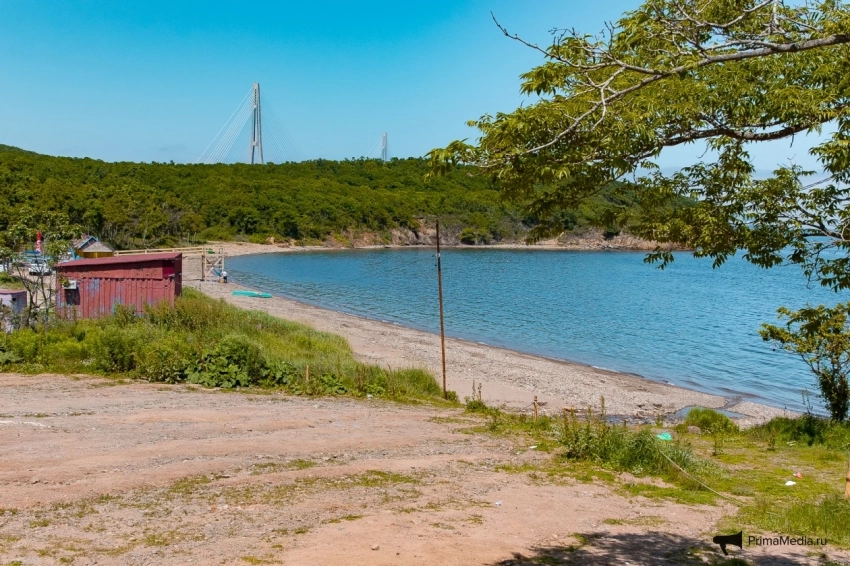 На острове Русский возле университетского кампуса есть прекрасный песчаный пляж с мелкими камешками. Бесплатная зона отдыха открыта для приморцев, которые доберутся до него по грунтовой дороге. На территории присутствуют бесплатная парковка, туалет, старые раздевалки и мусорные баки, которые, к сожалению, часто завалены мусором. На пляже есть и кафе с достаточно богатым и сытным меню.